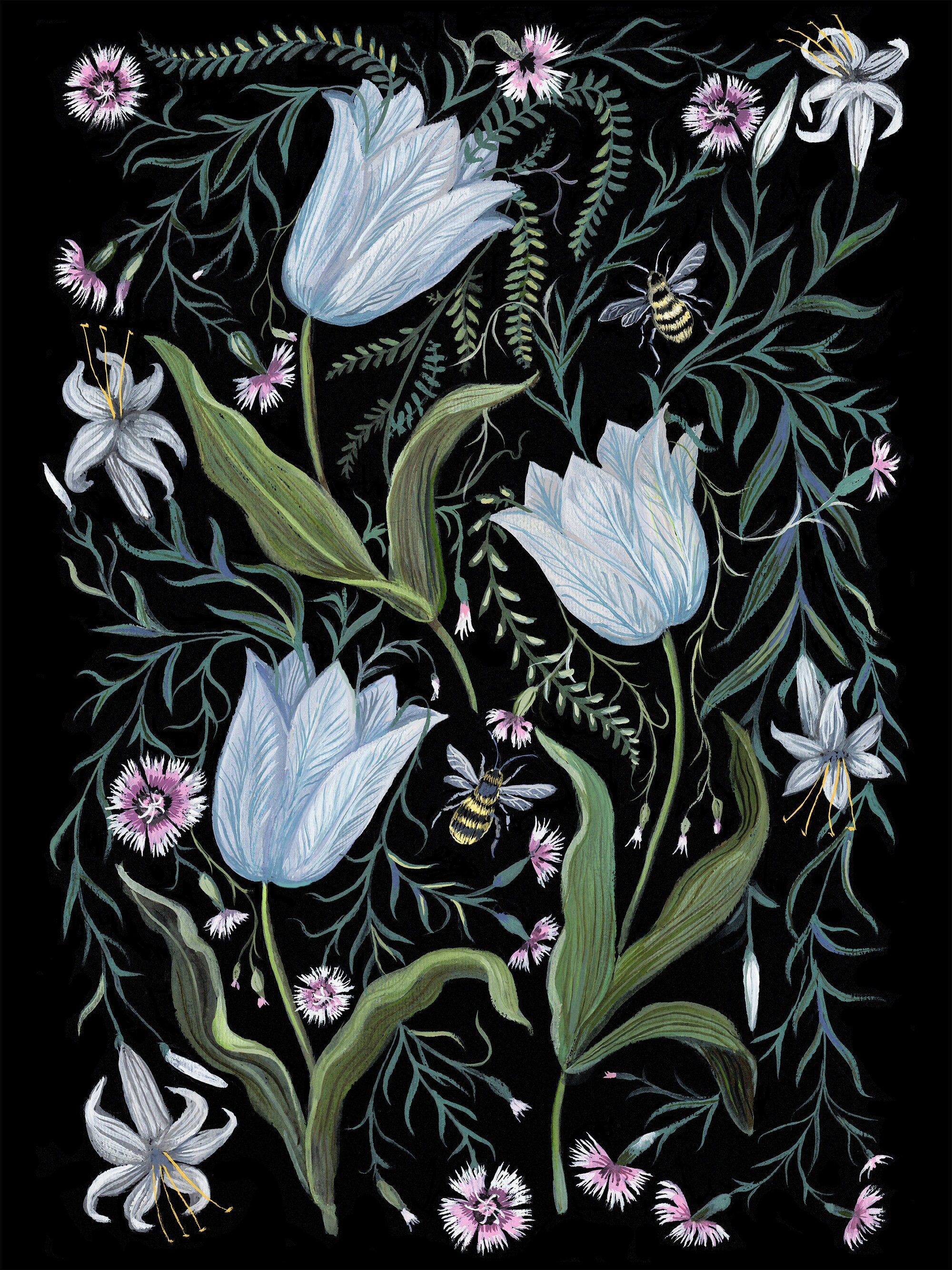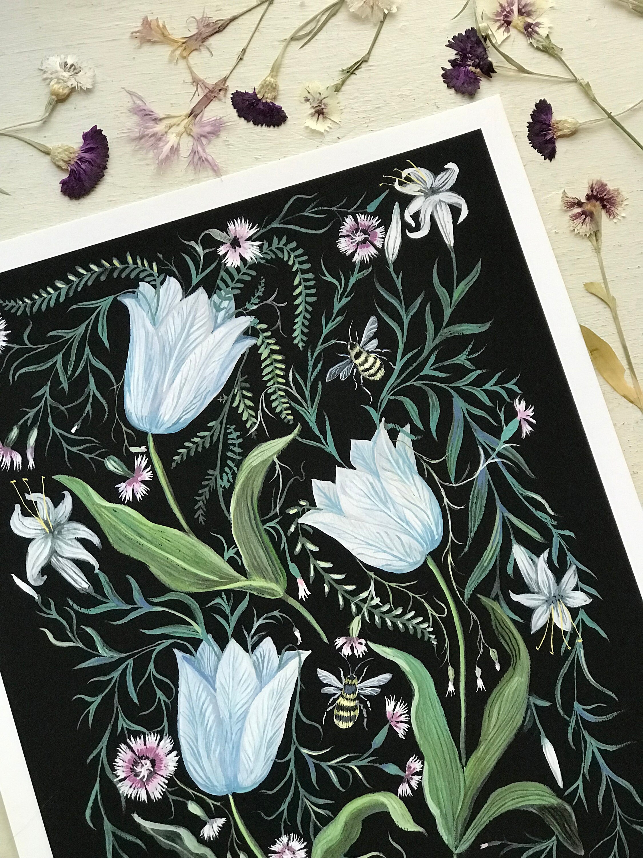 A print of the original painting "Through the Tulips"Available in 8 1/2" x 11" and 11" x 14" sizesPrinted on heavy weight 100% cotton, acid free, natural white paper. Signed and dated on the front