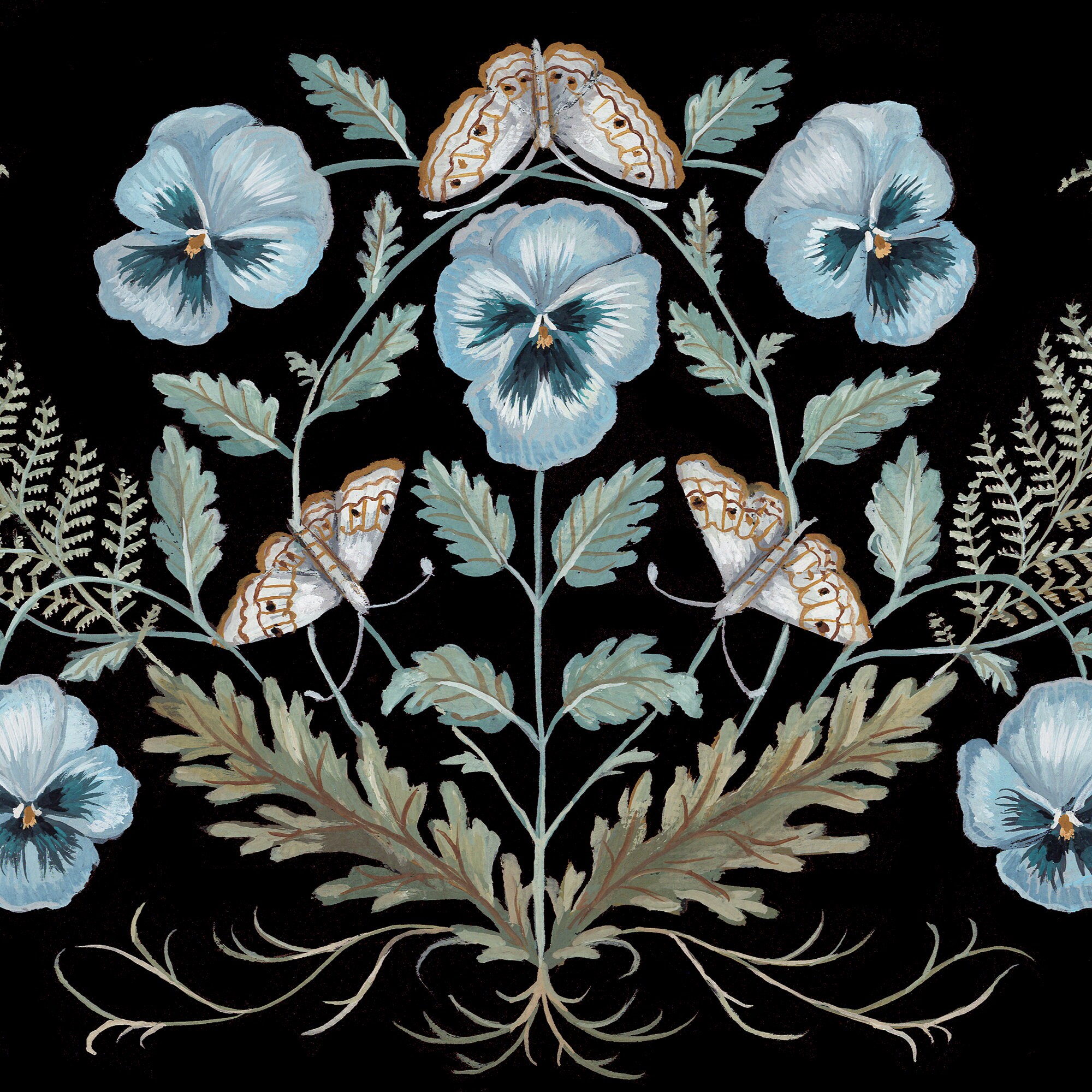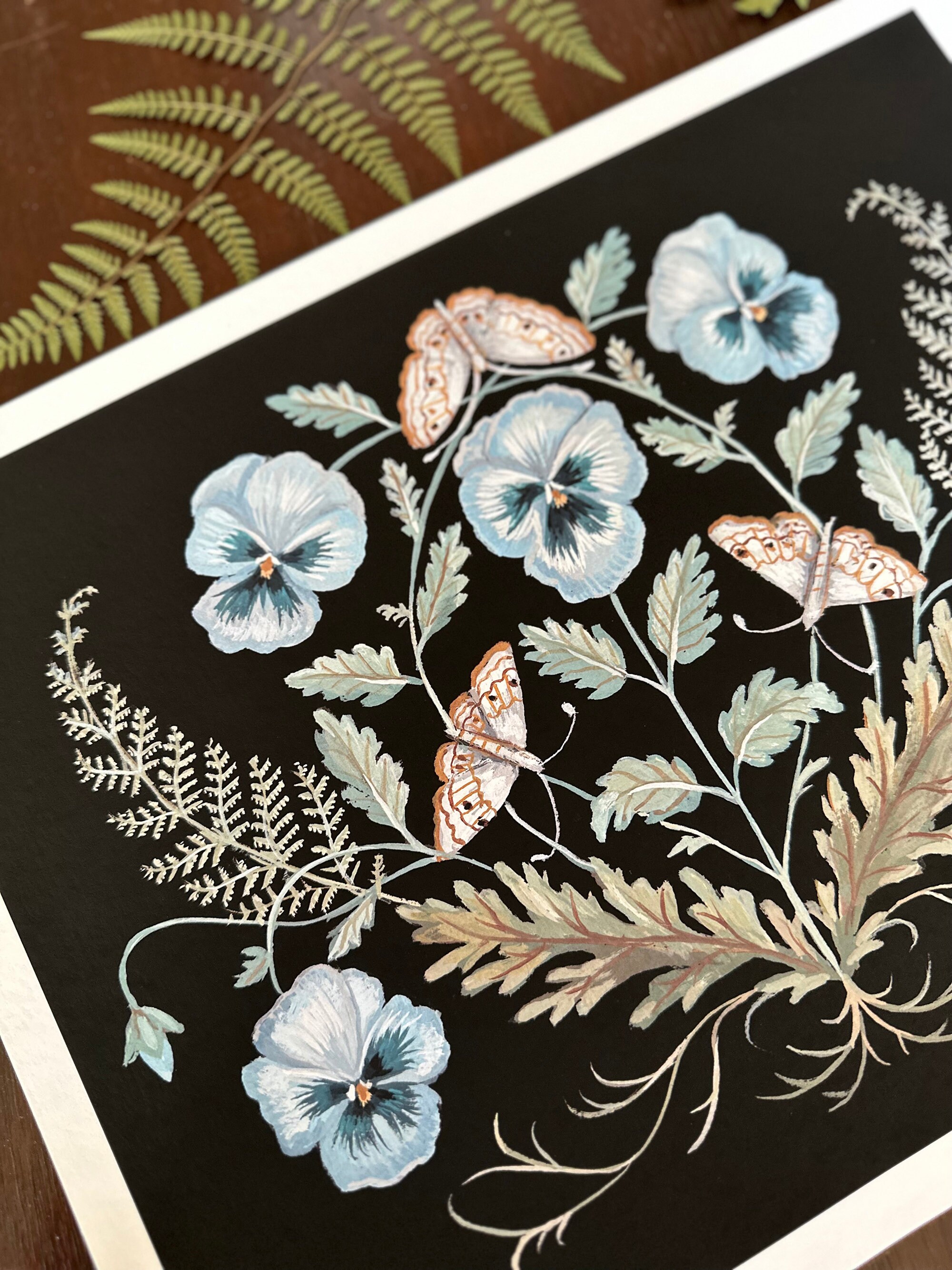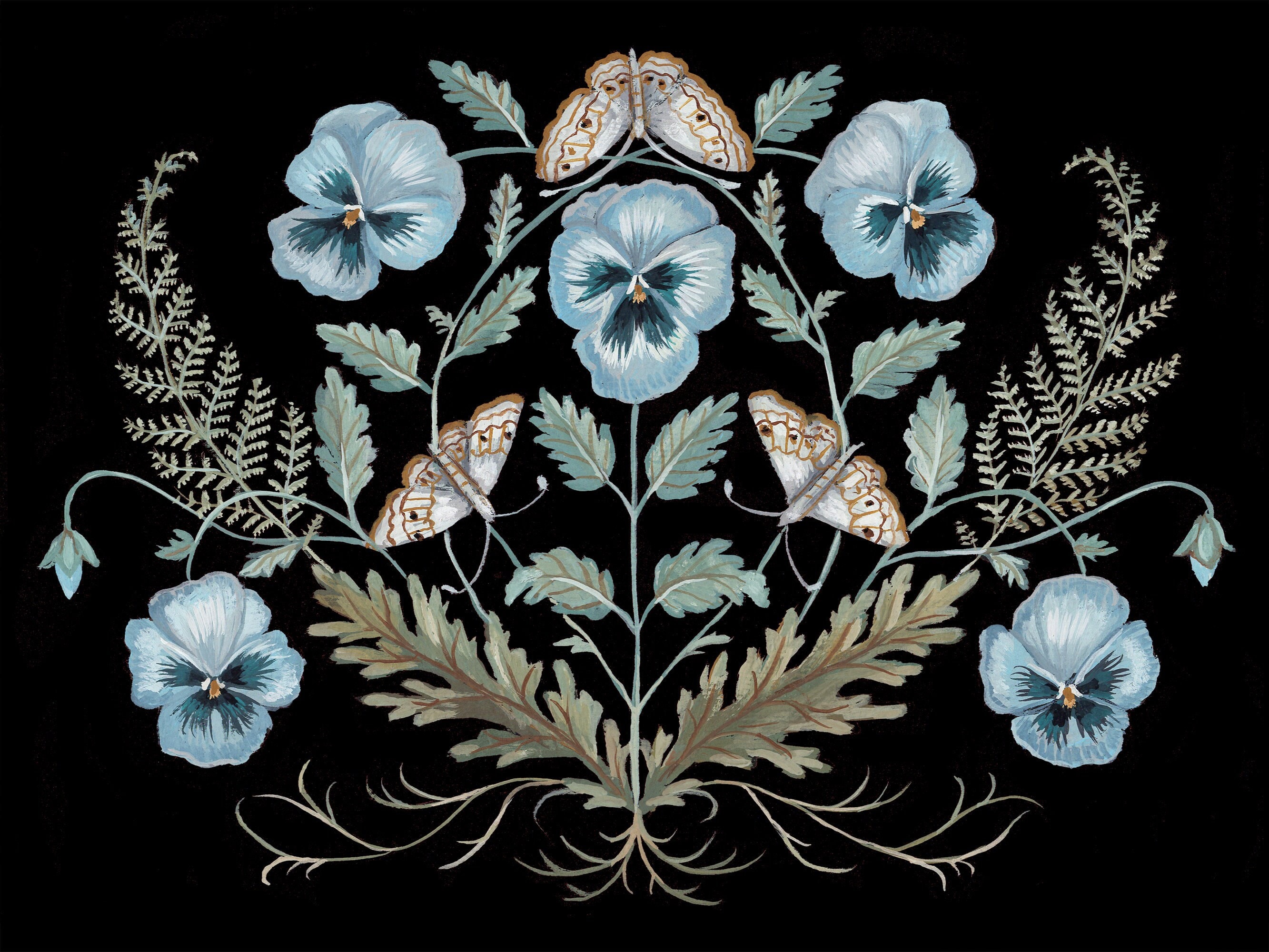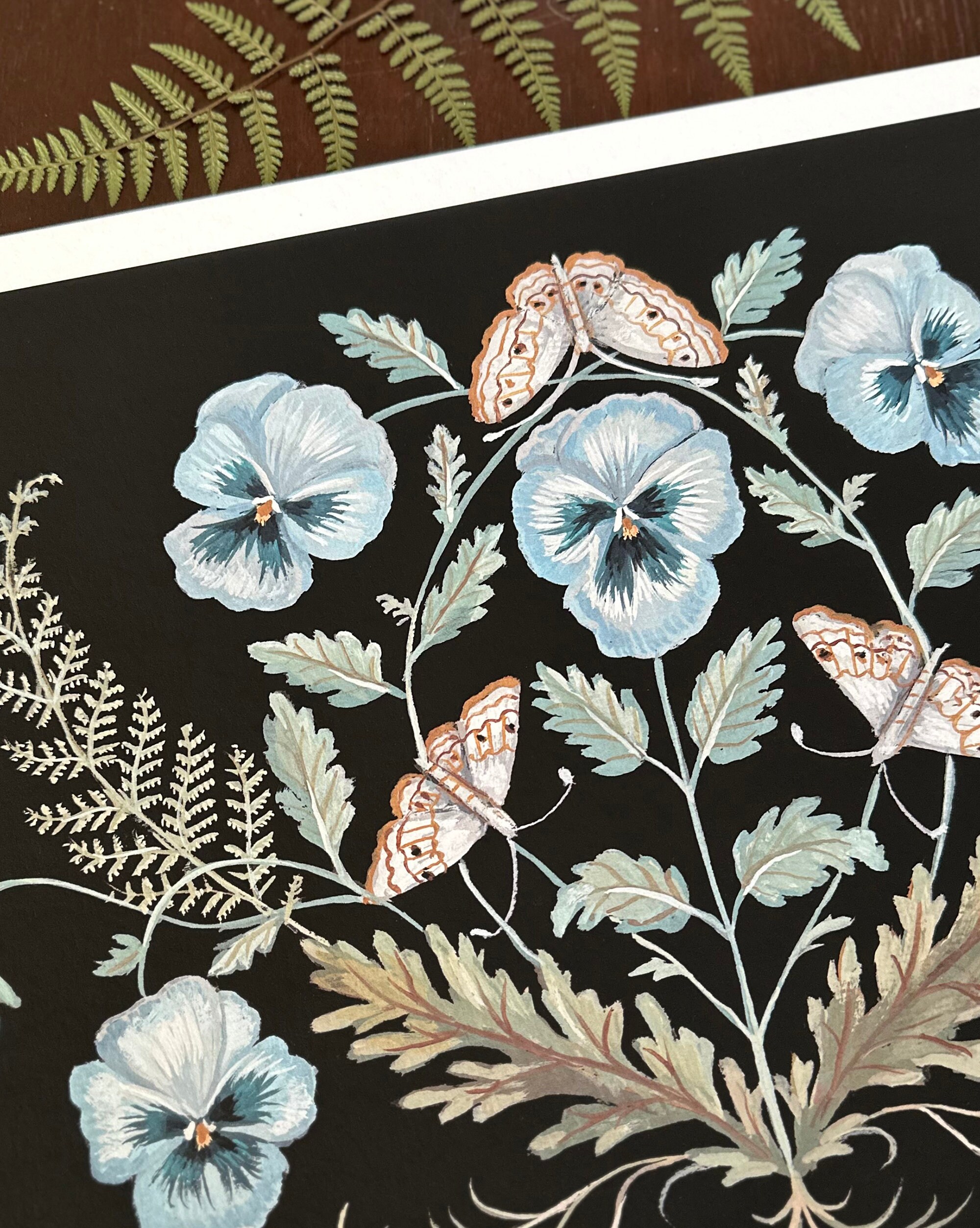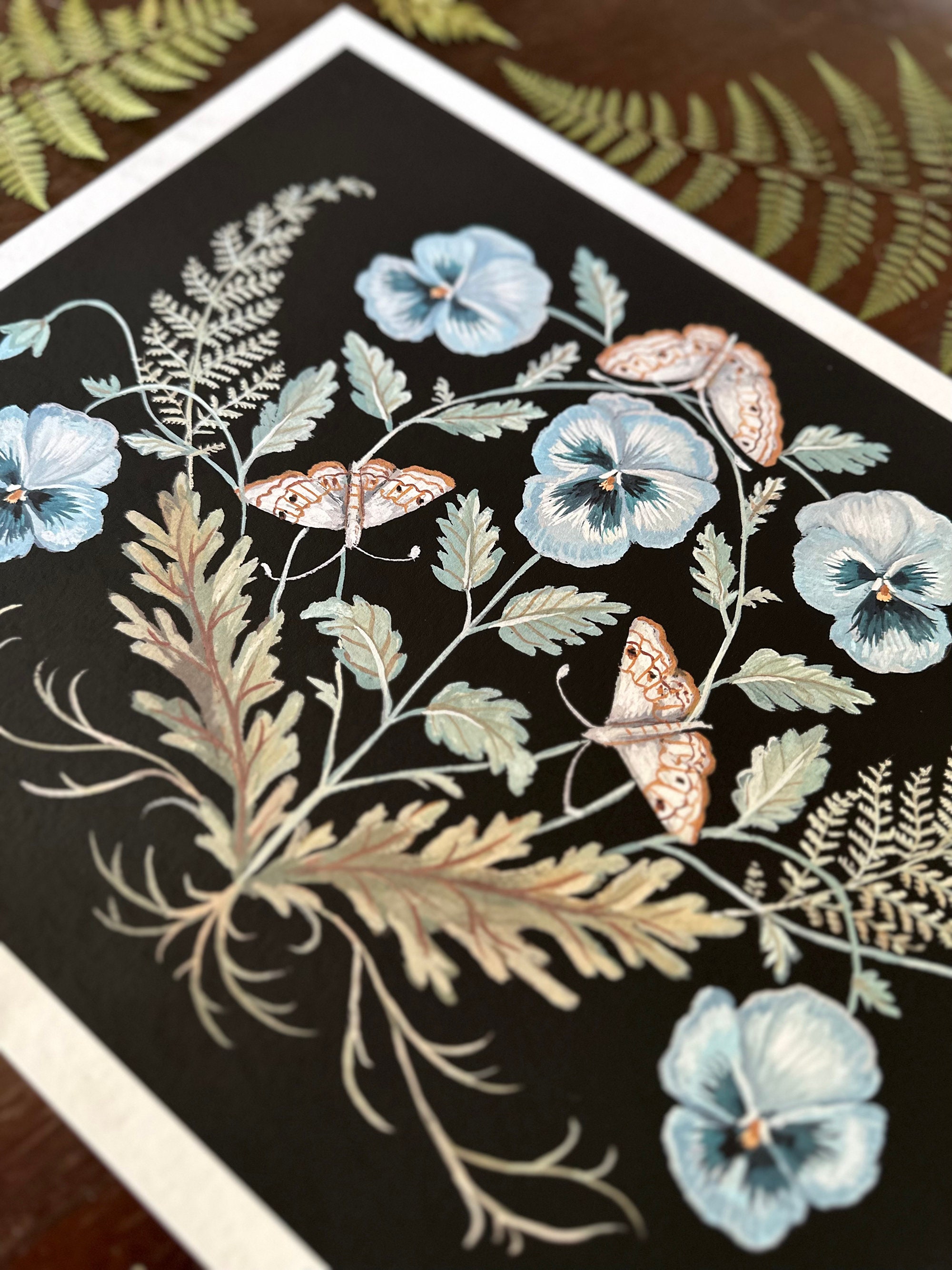 A print of the original painting Pansies and MothsAvailable in 8 1/2" x 11" and 11" x 14" sizesPrinted on heavy weight 100% cotton, acid free, natural white paper. Signed and dated on the front