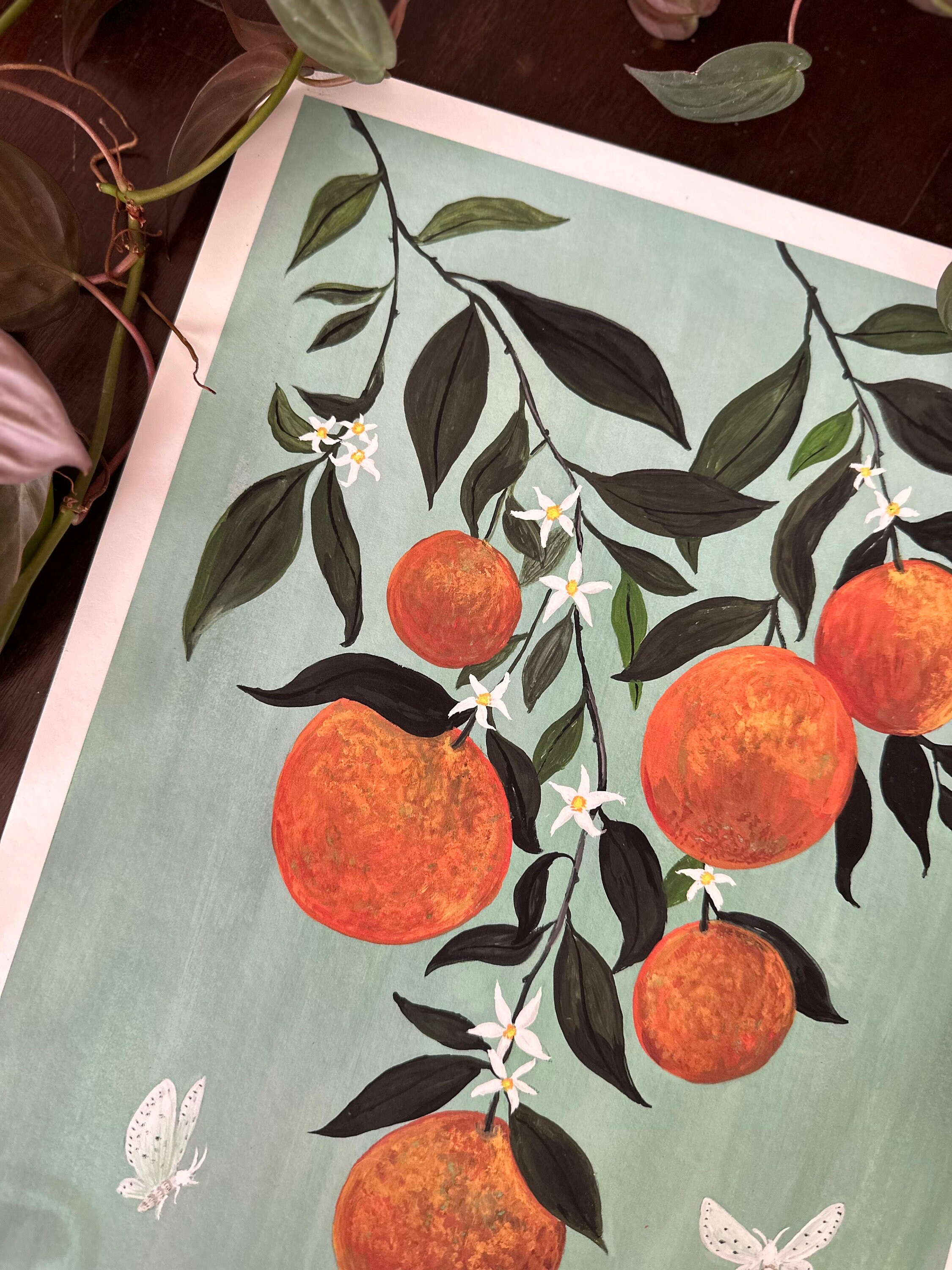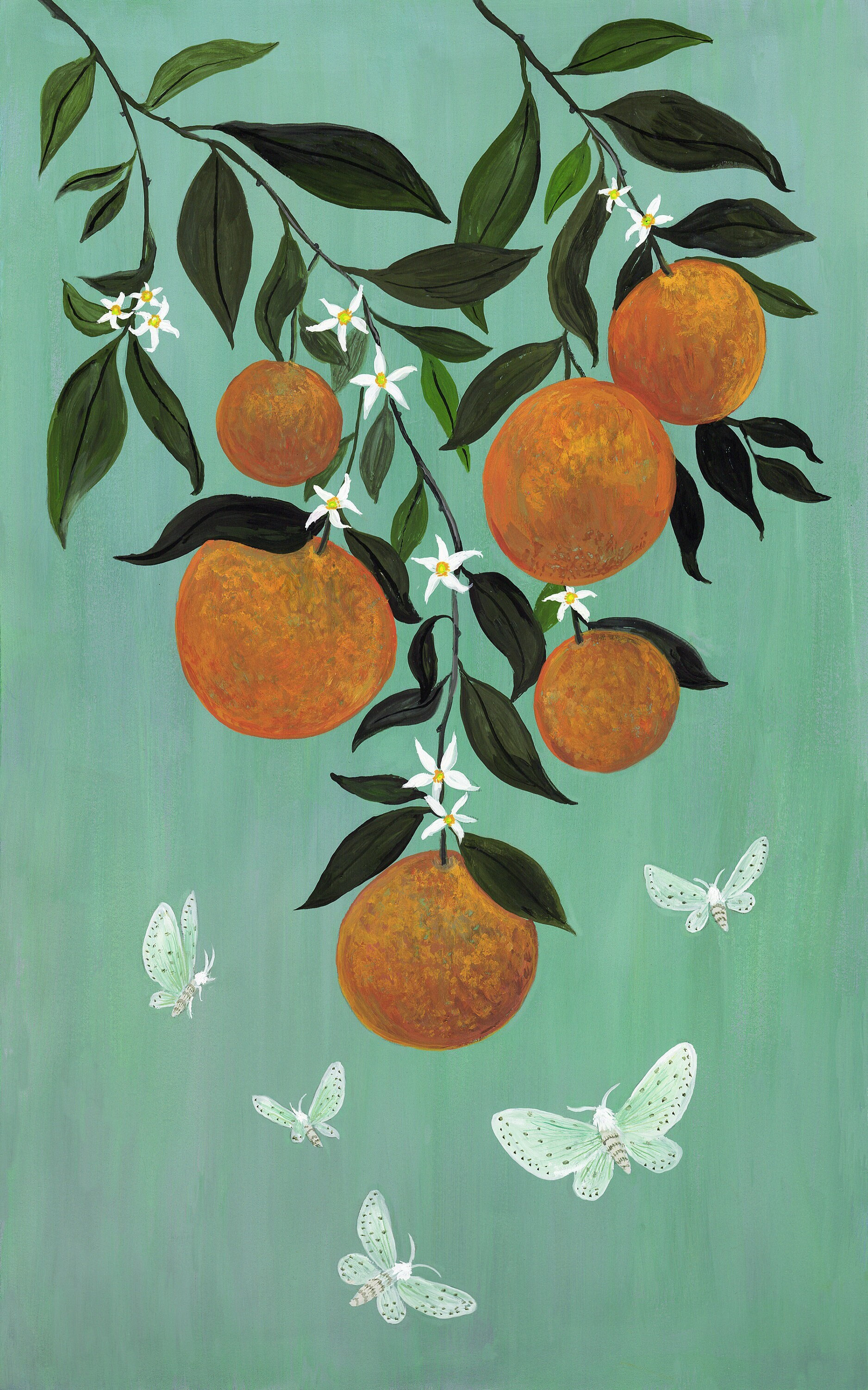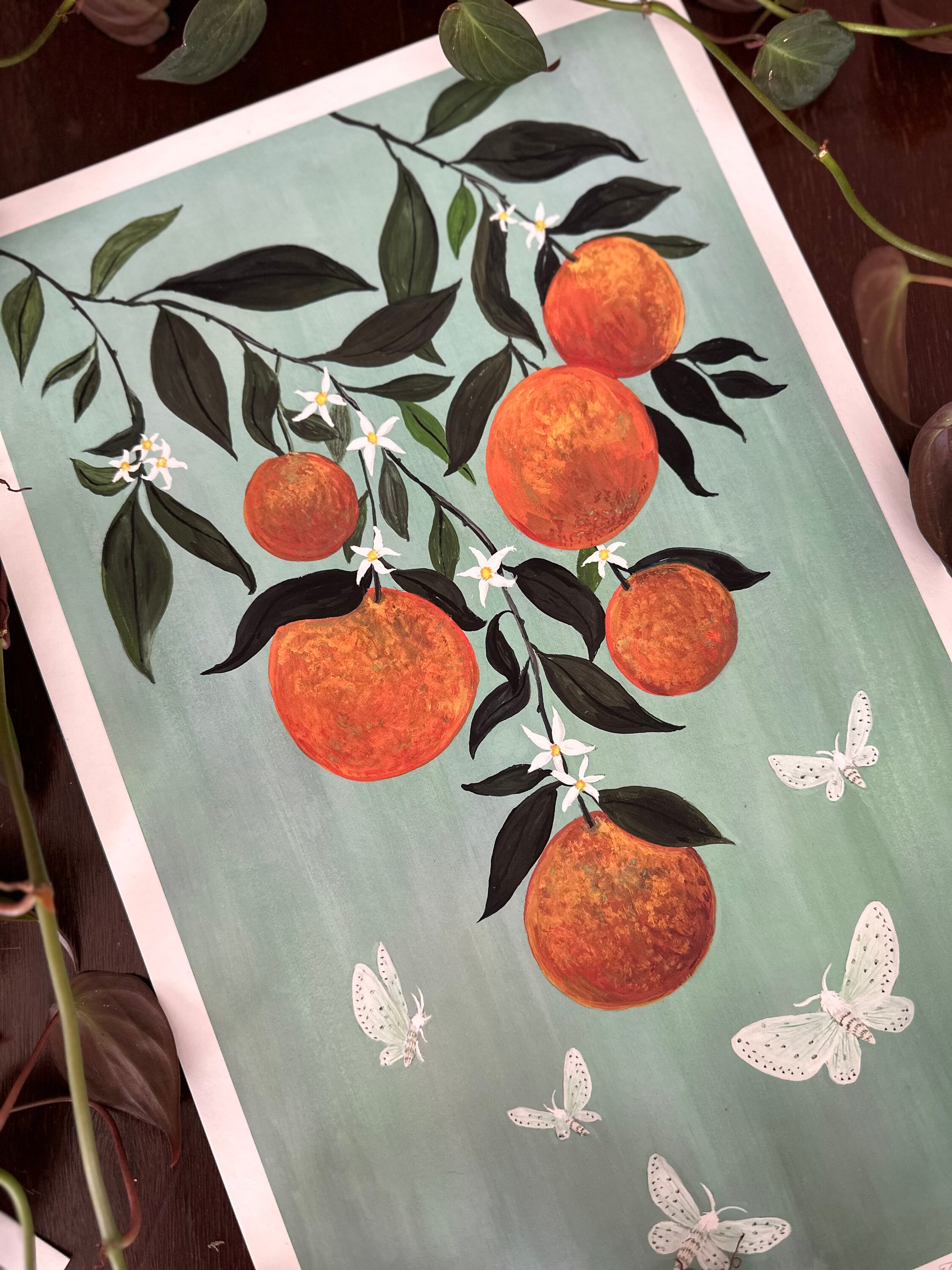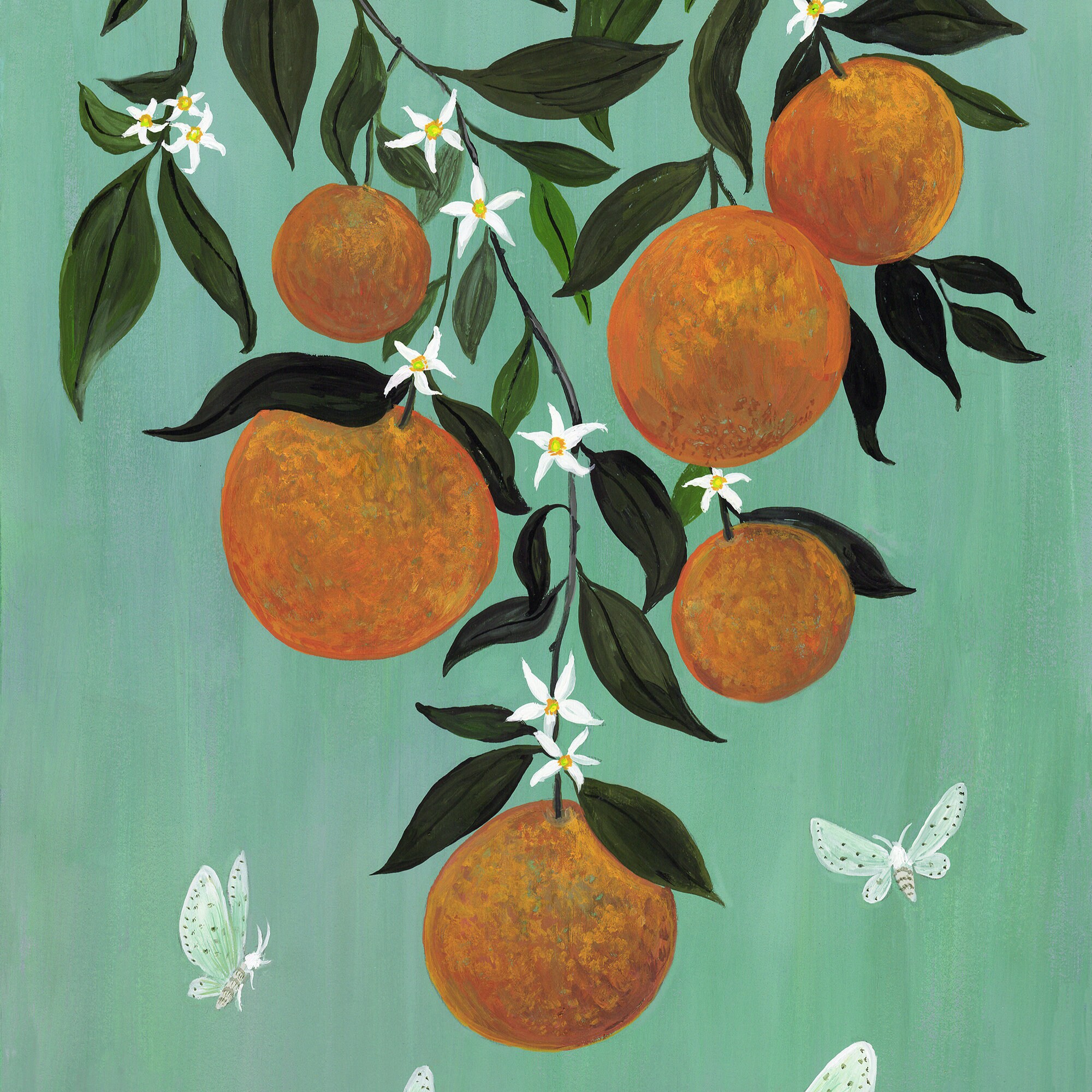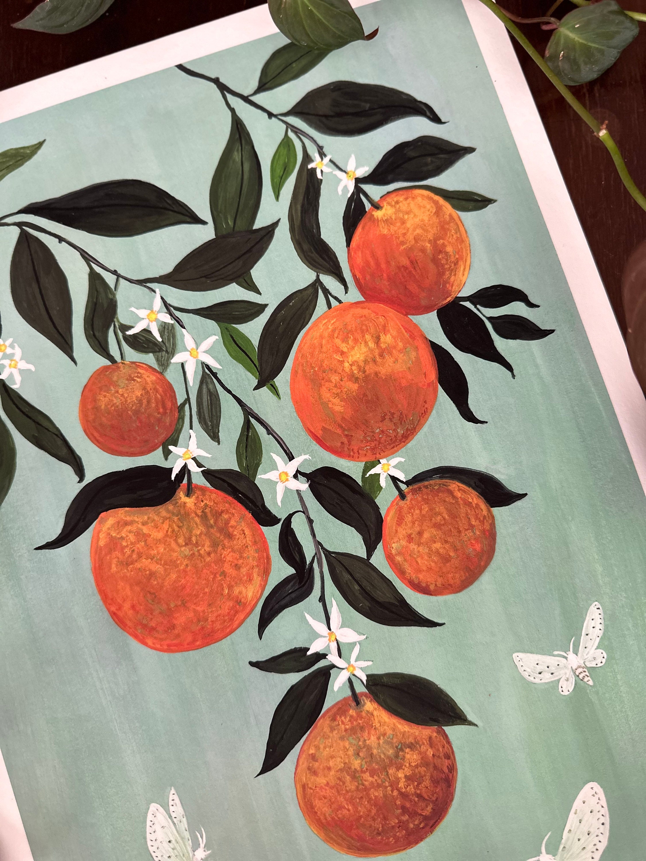 A print of the original painting, Moths in the Orange Tree11" x 17", printed with a 1/2" white border.Printed on heavy weight 100% cotton, acid free, natural white paper. Titled, signed and dated on the front.