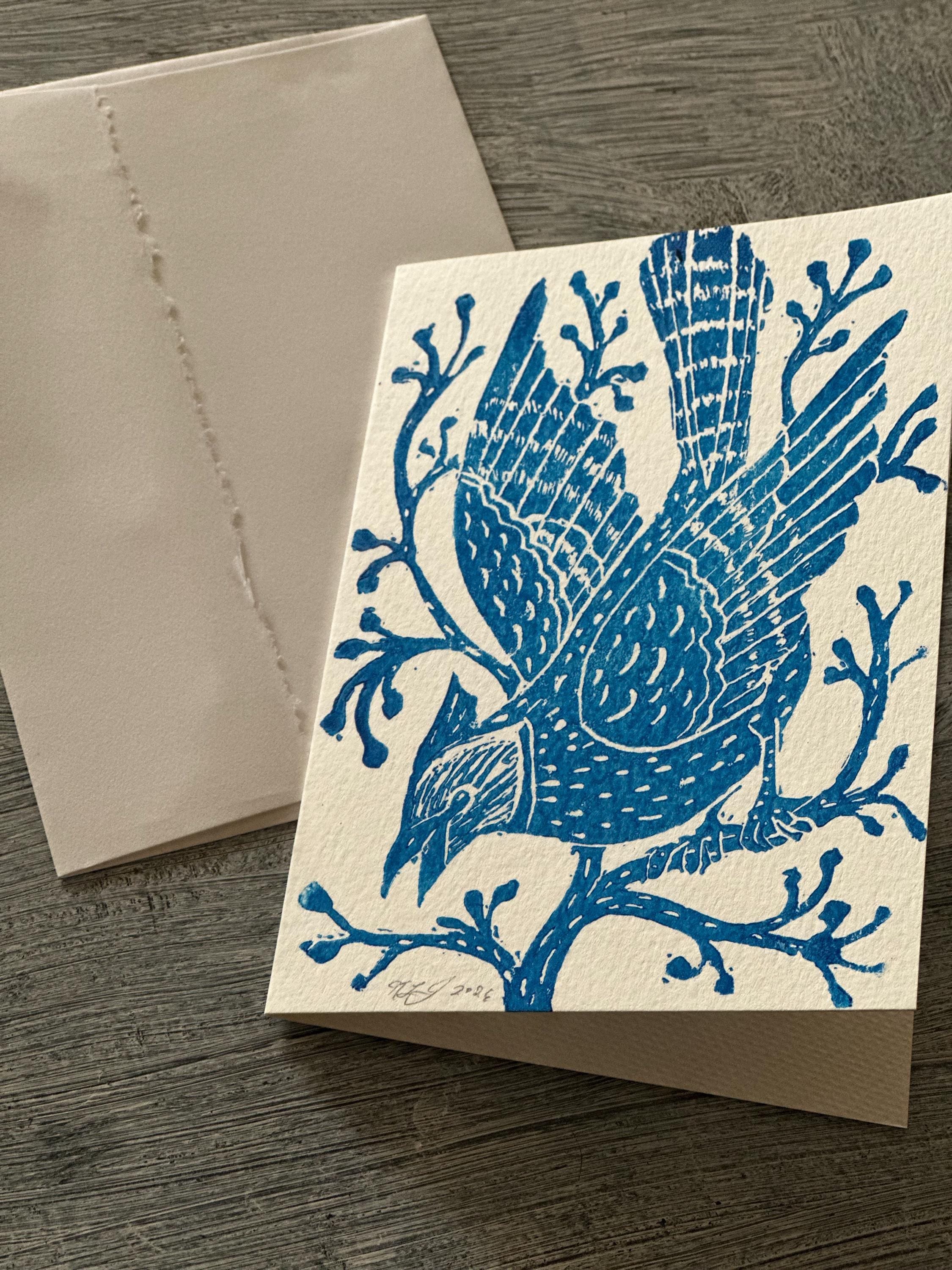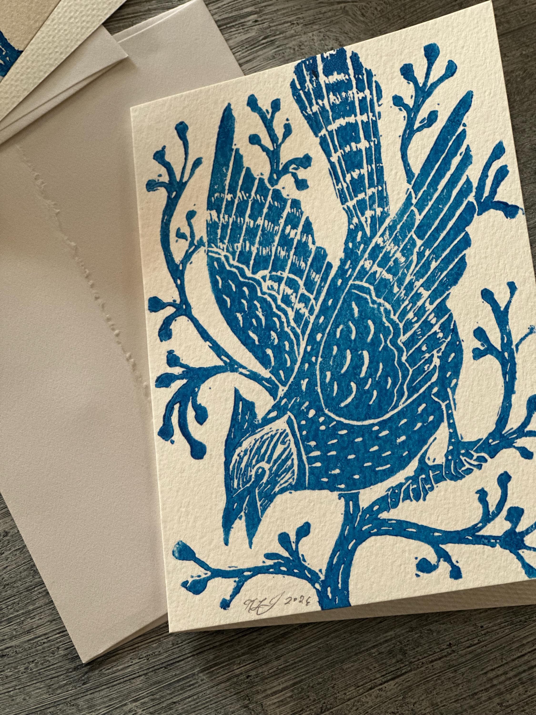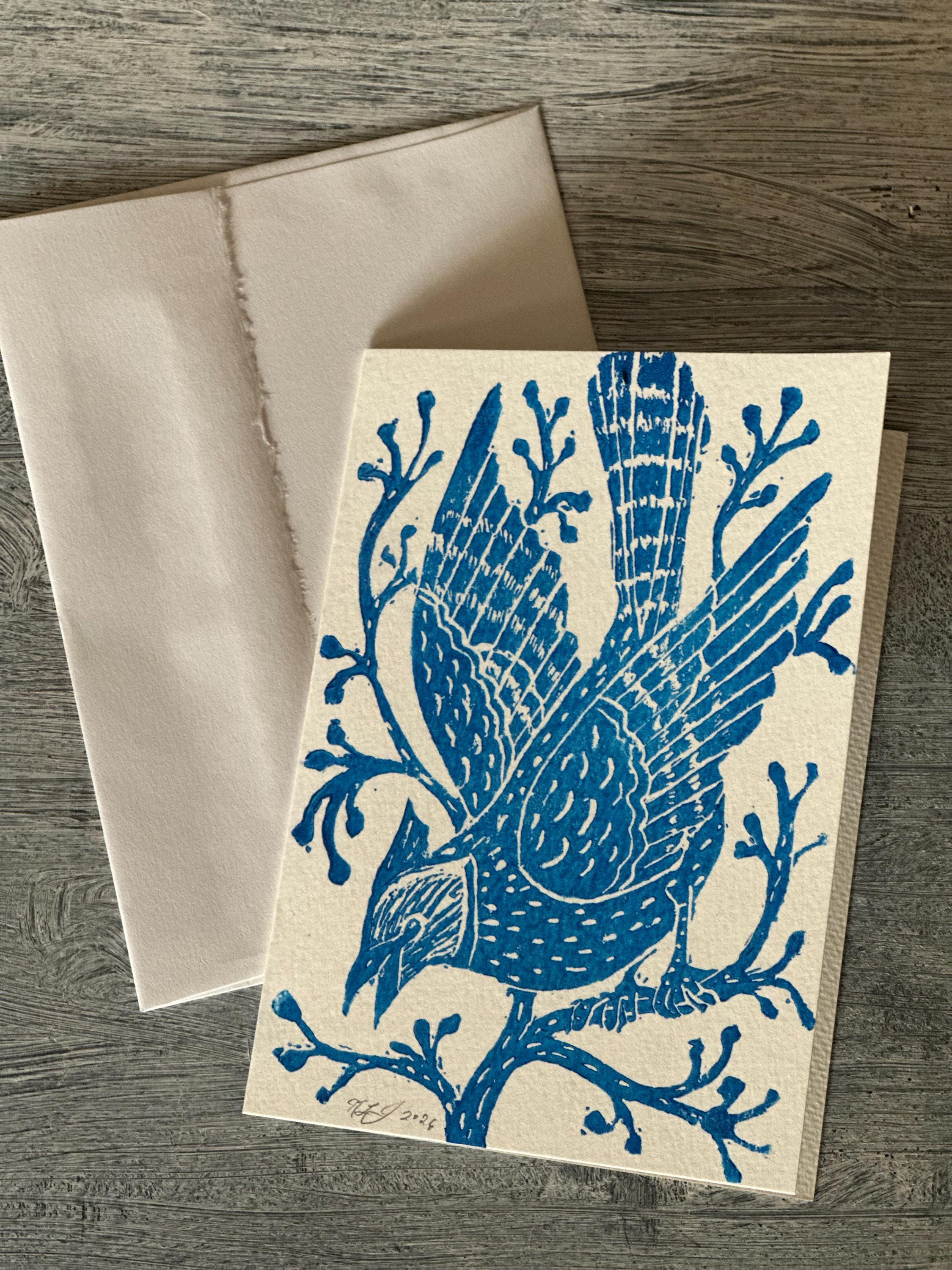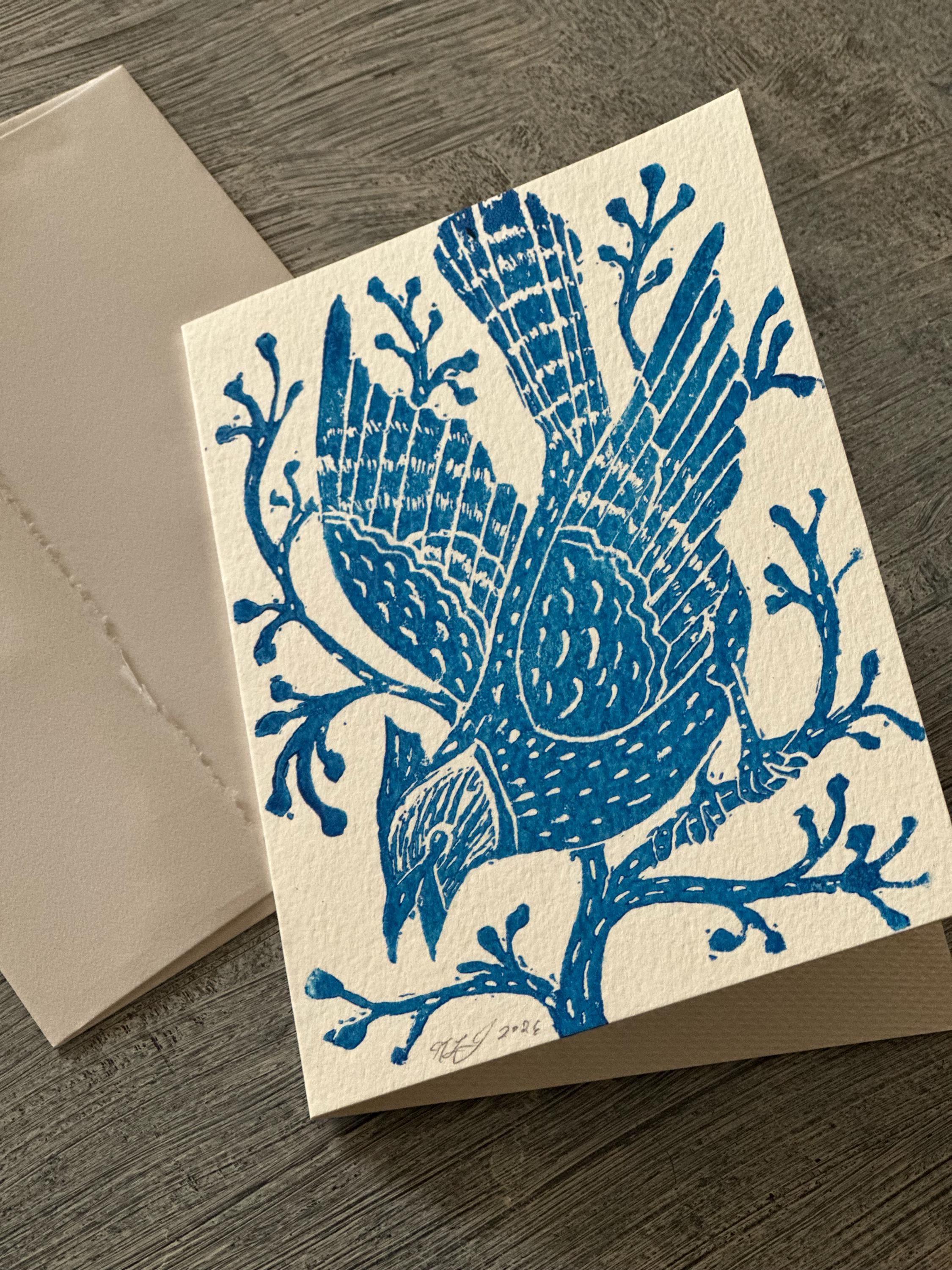A block-printed "Blue Jay in the Winter Woods" note card. Each card is hand printed which creates slight variations, so each print is completely unique.
