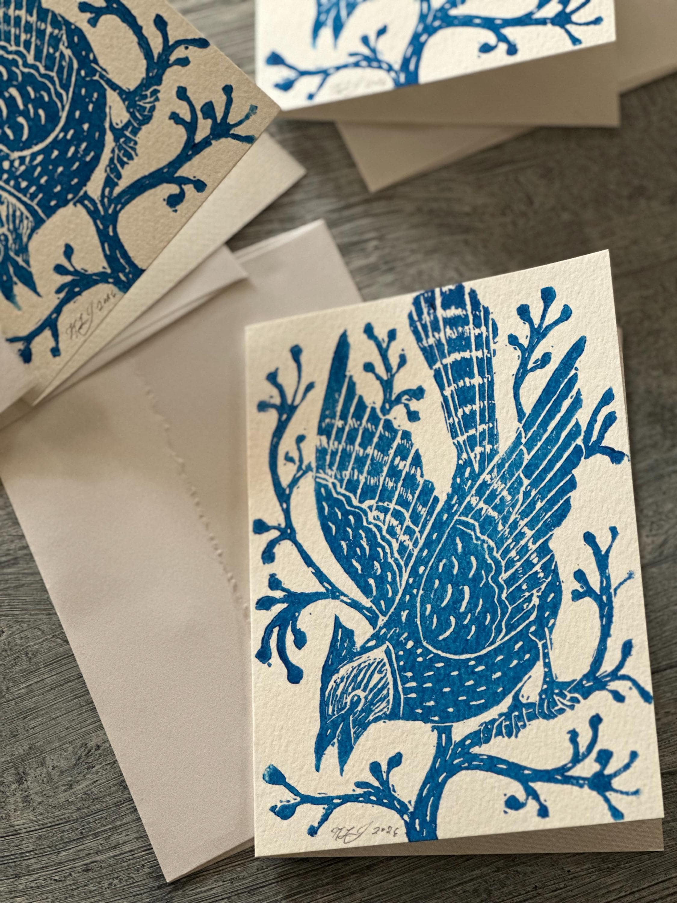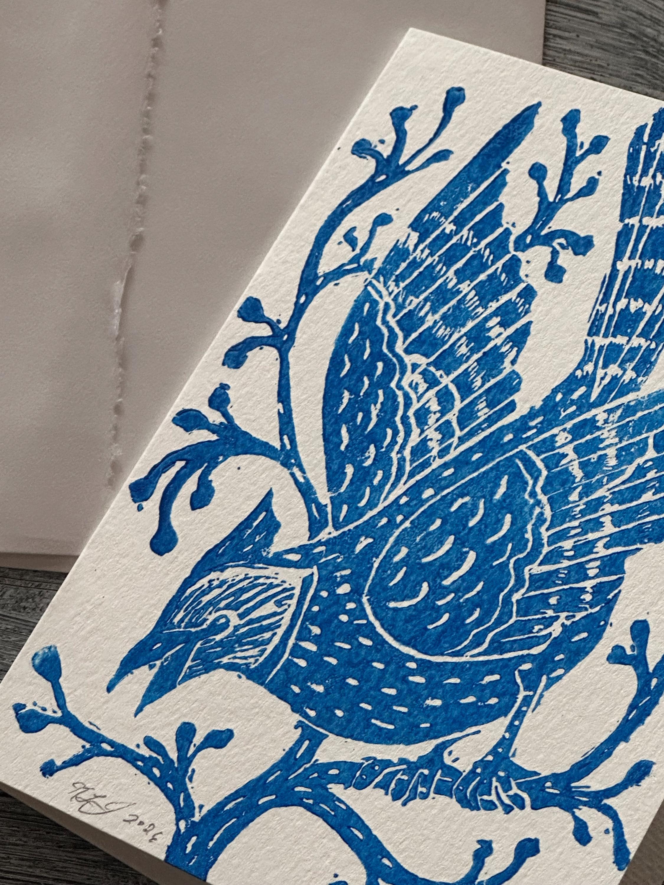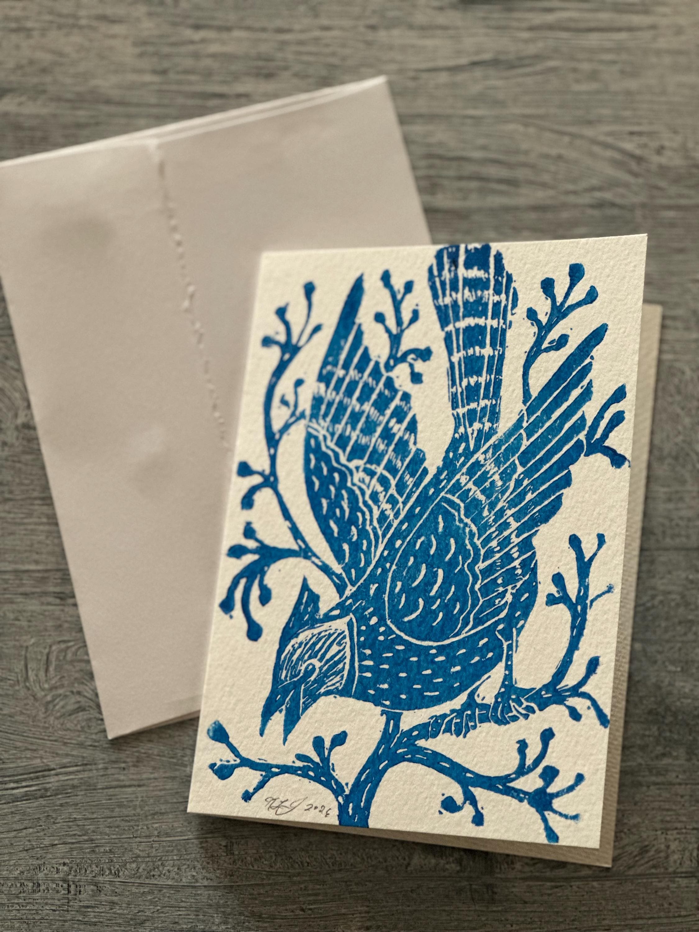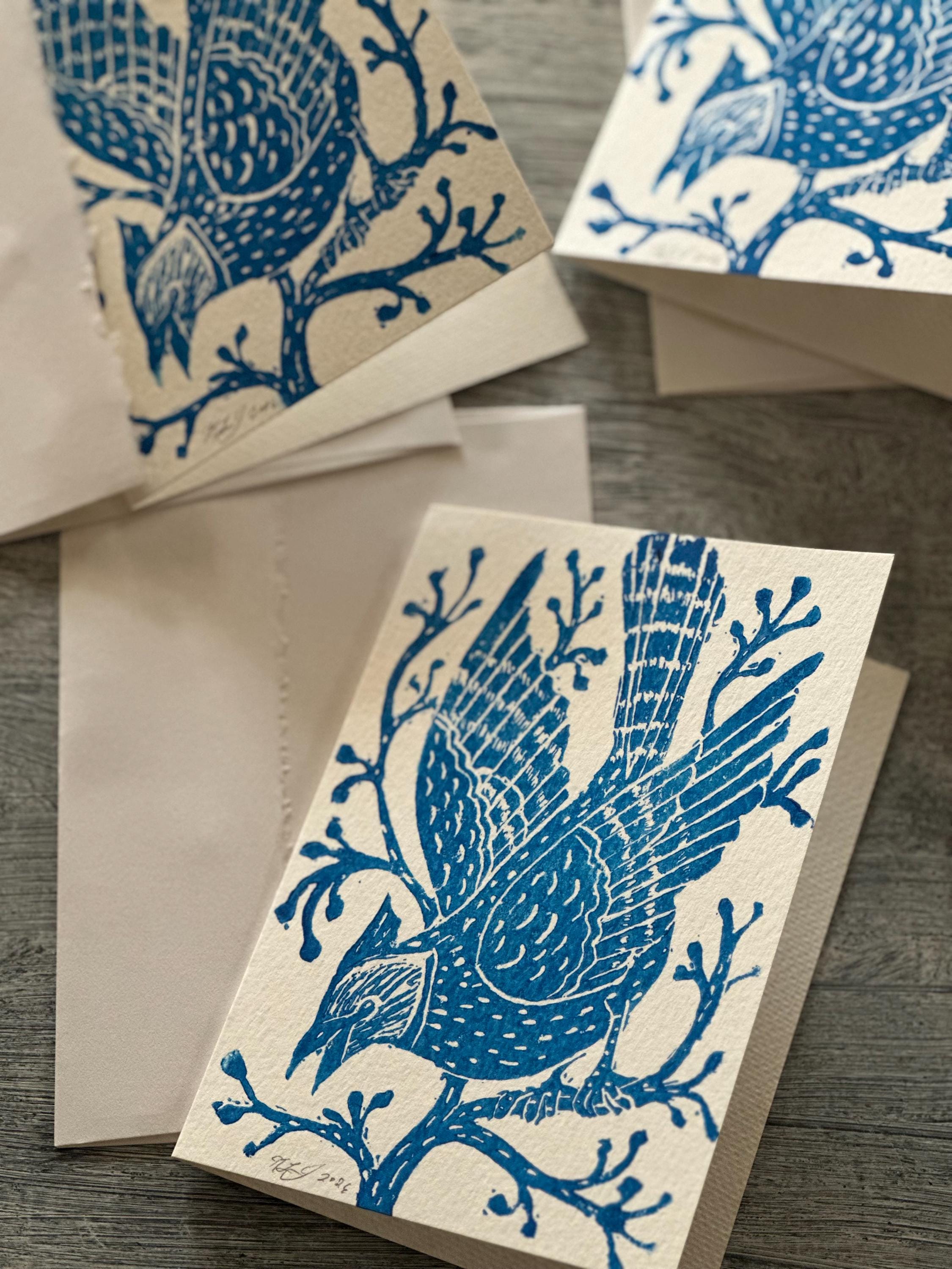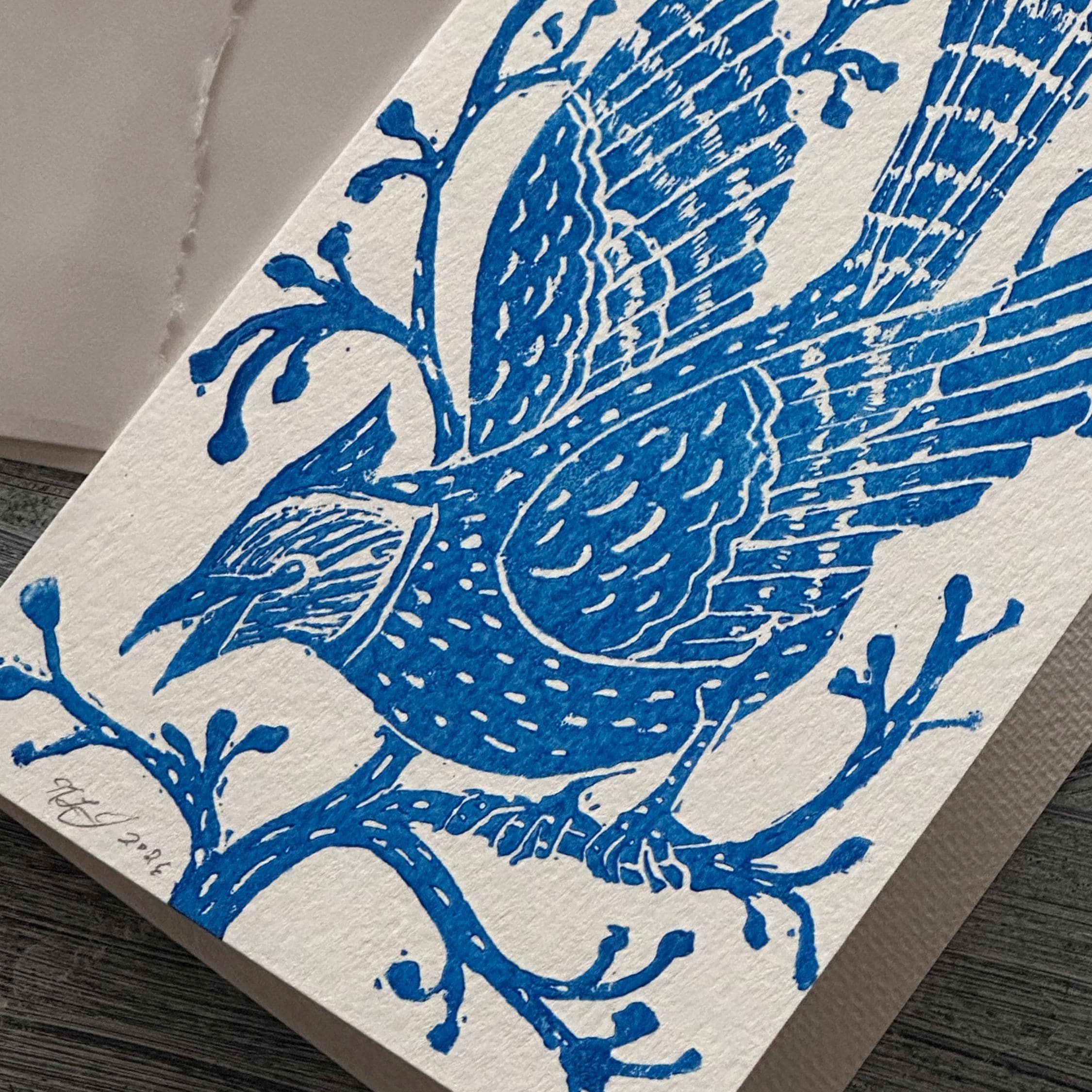 A block-printed "Blue Jay in the Winter Woods" note card. Each card is hand printed which creates slight variations, so each print is completely unique.