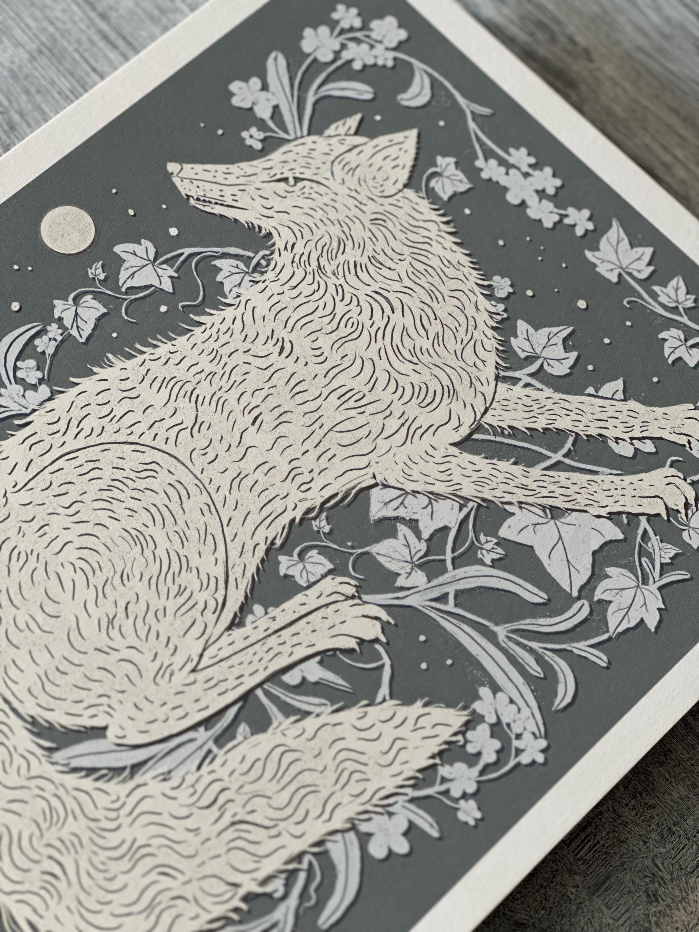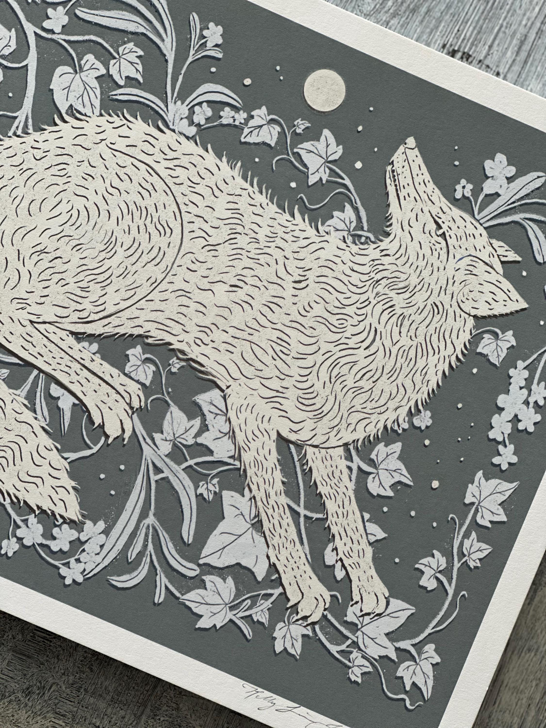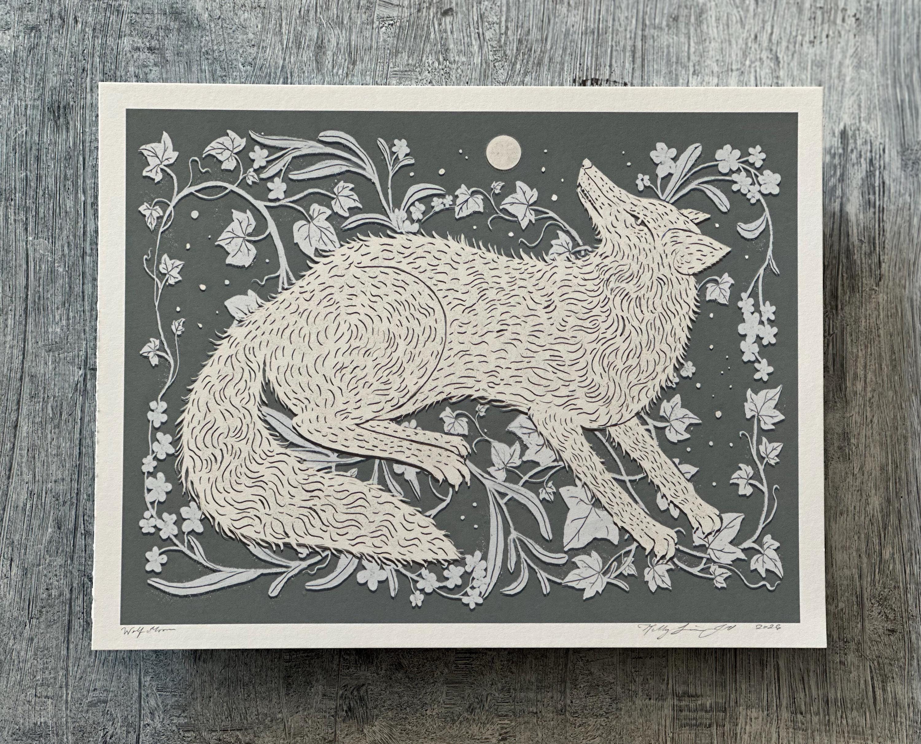 A print of the original illustration, Wolf Moon.Available in 8 1/2" x 11" and 11" x 14" sizes.Printed on heavy weight 100% cotton, acid free, natural white paper. Titled, signed and dated on the front