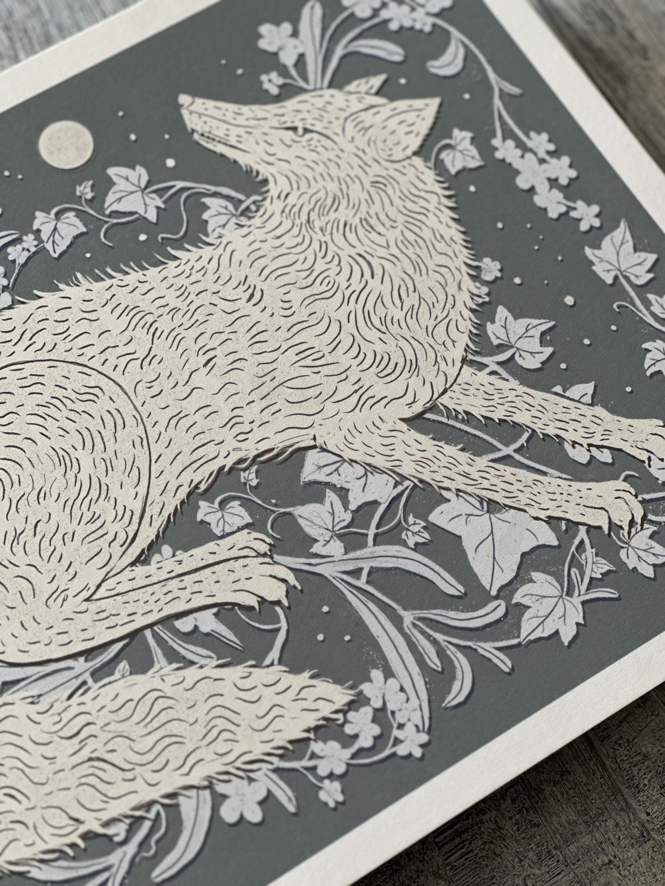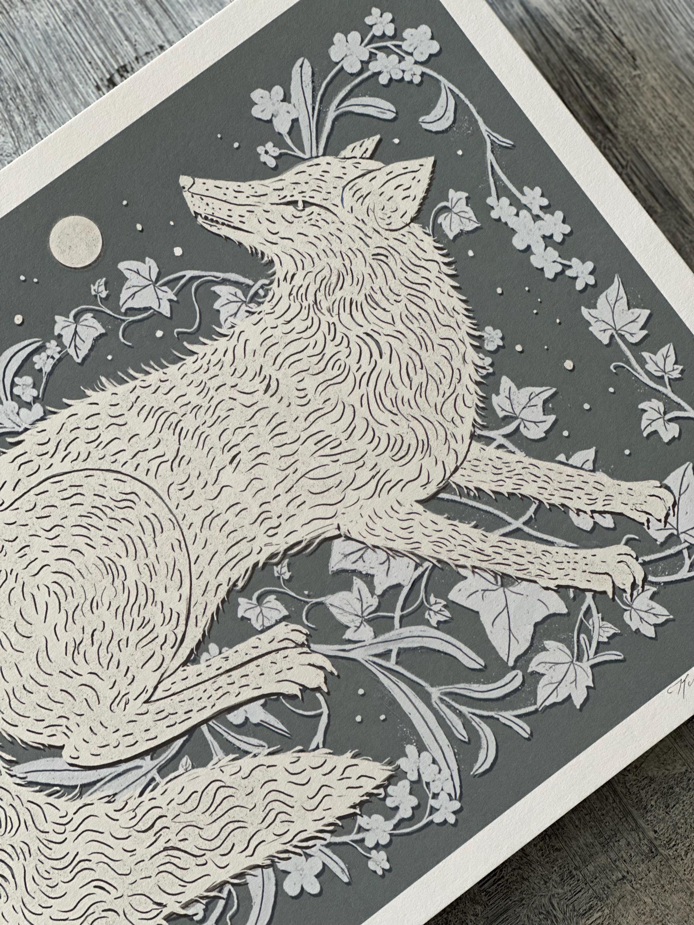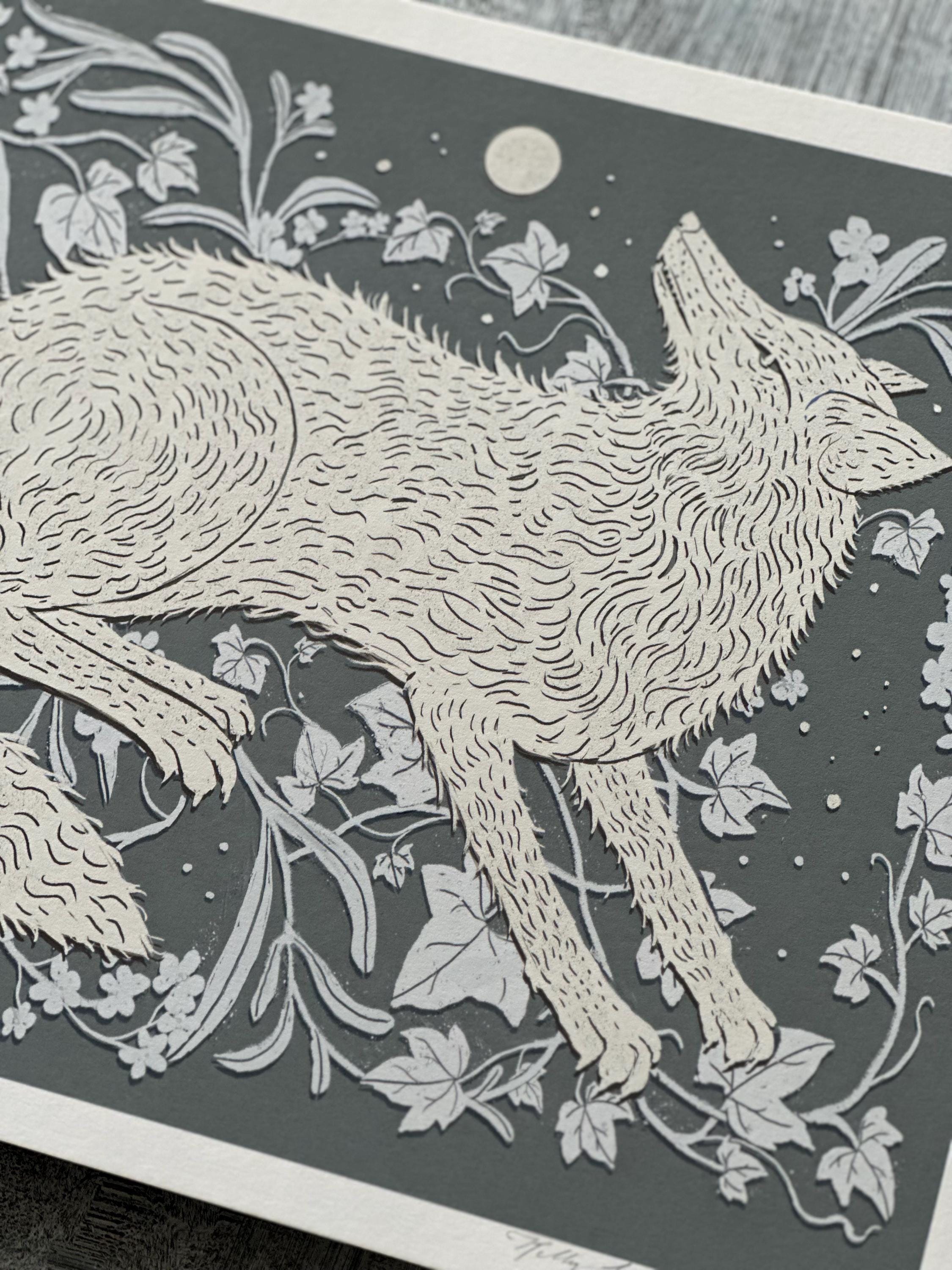 A print of the original illustration, Wolf Moon.Available in 8 1/2" x 11" and 11" x 14" sizes.Printed on heavy weight 100% cotton, acid free, natural white paper. Titled, signed and dated on the front