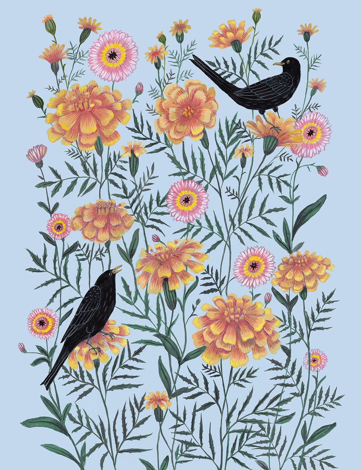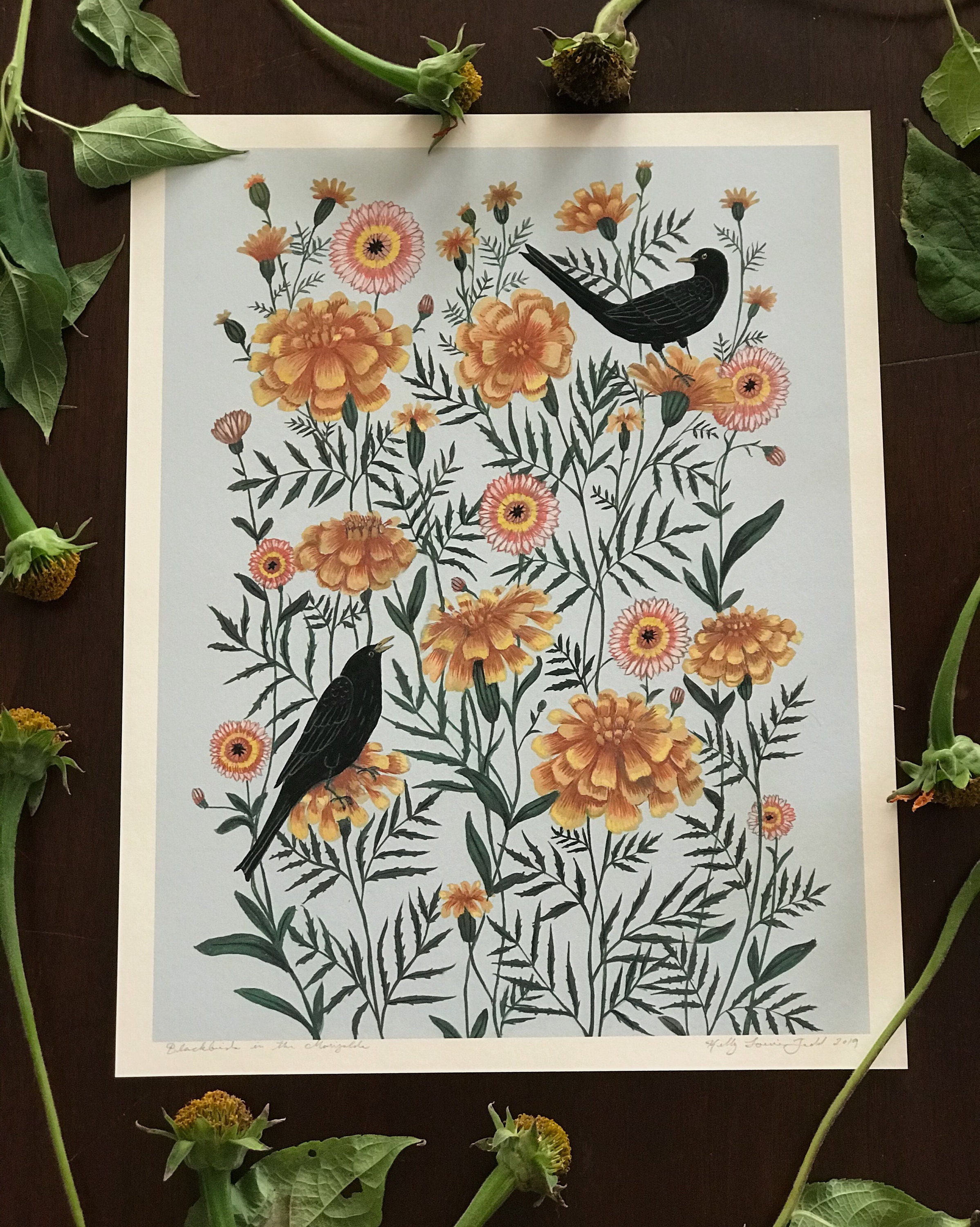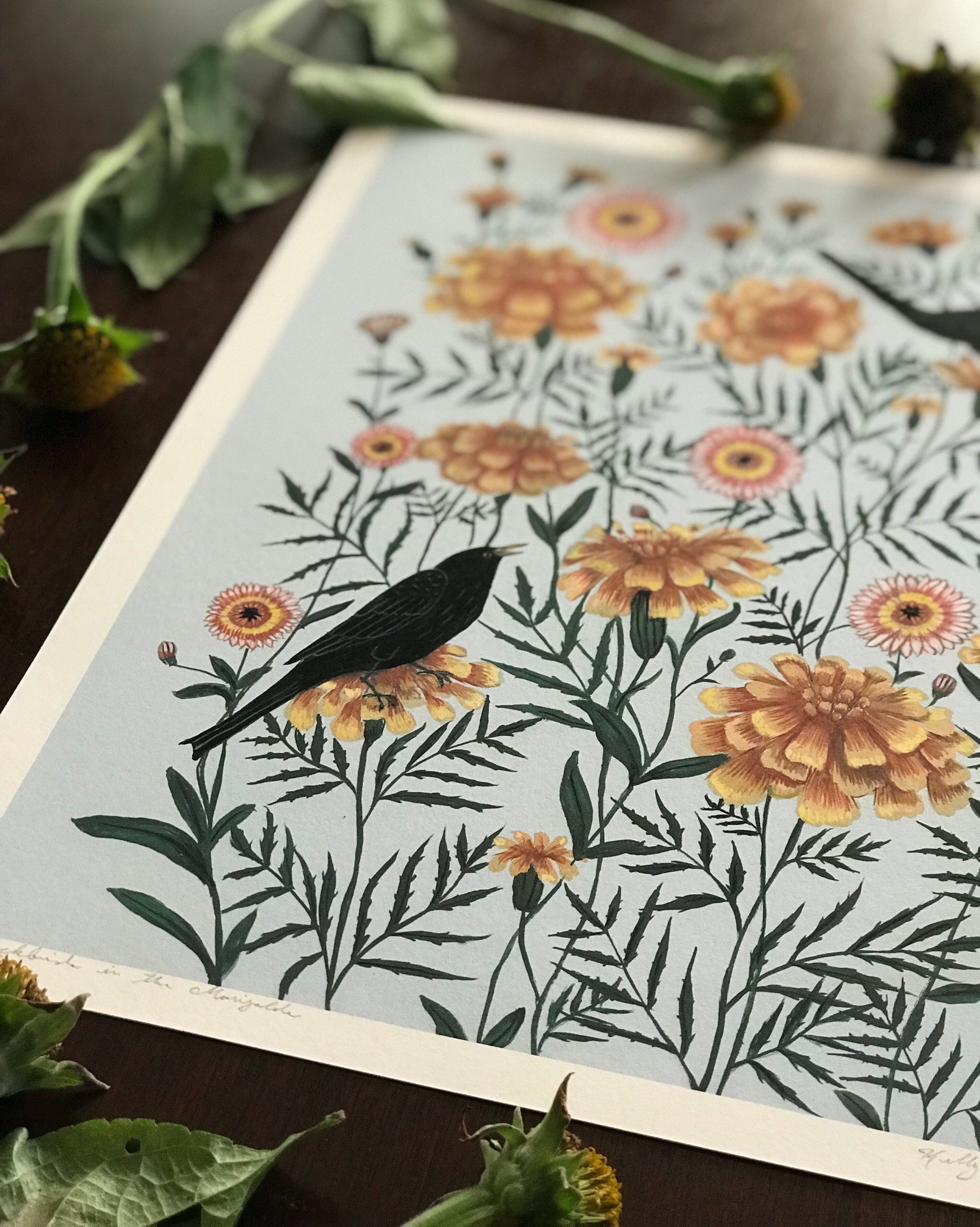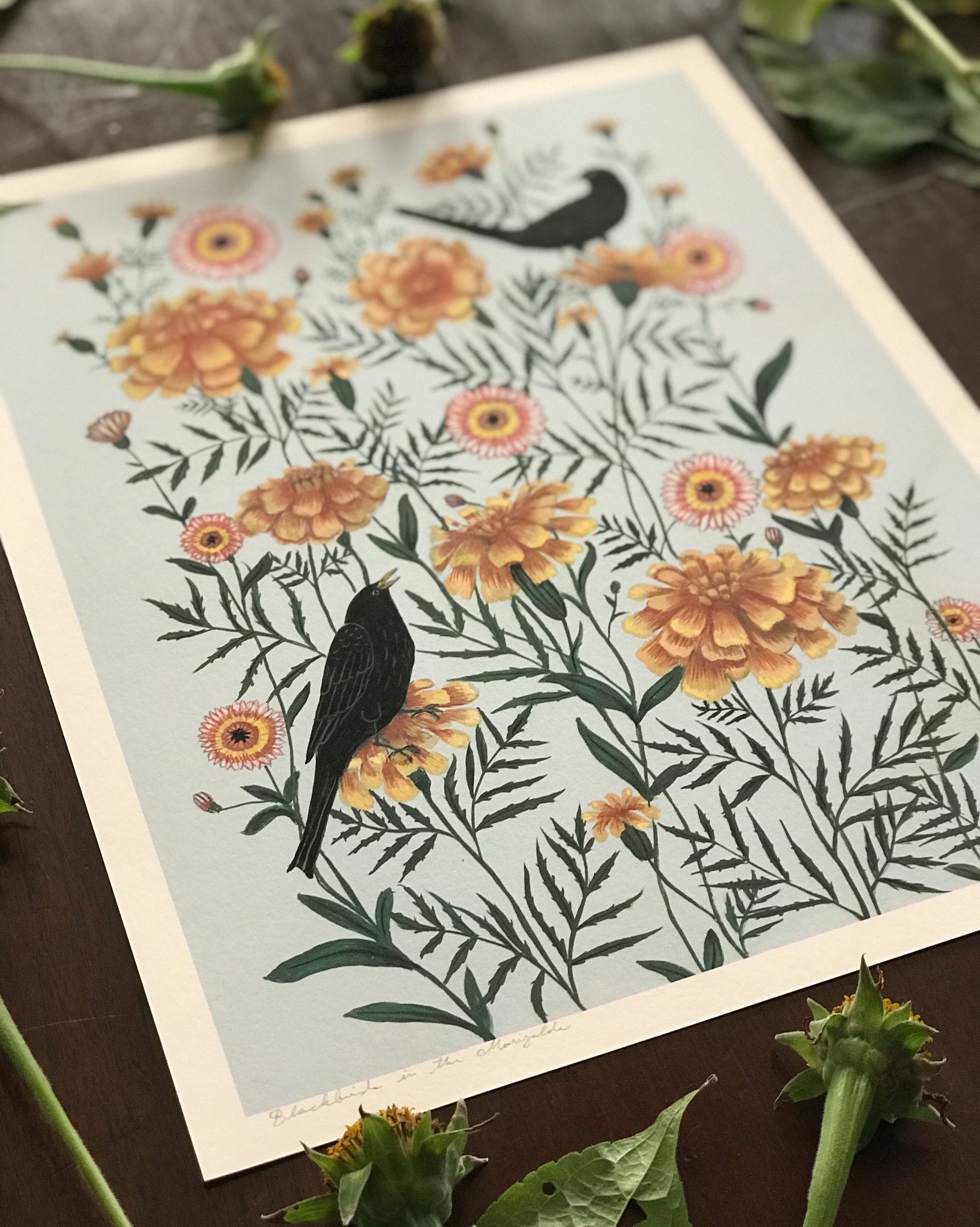 A print of the original painting "Blackbirds in the Marigolds"Available in 8 1/2" x 11" and 11" x 14" sizesPrinted on heavy weight 100% cotton, acid free, natural white paper. Signed and dated on the front