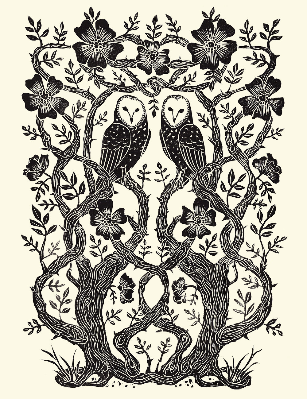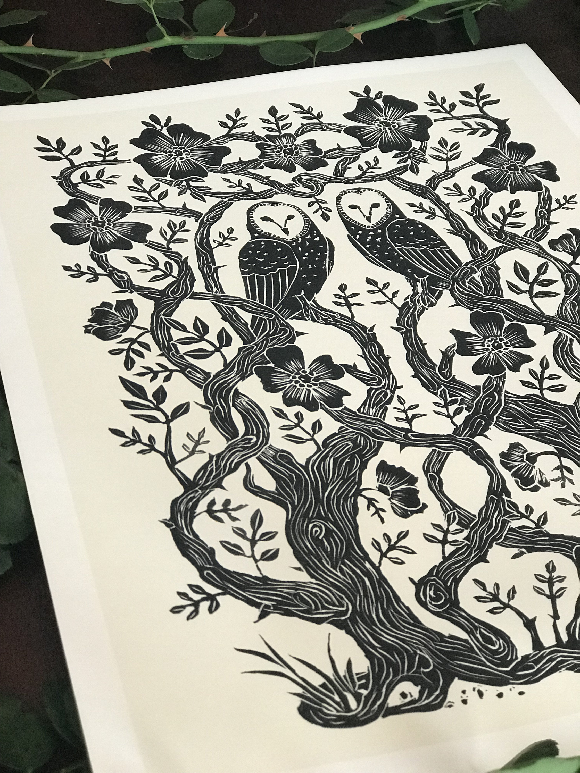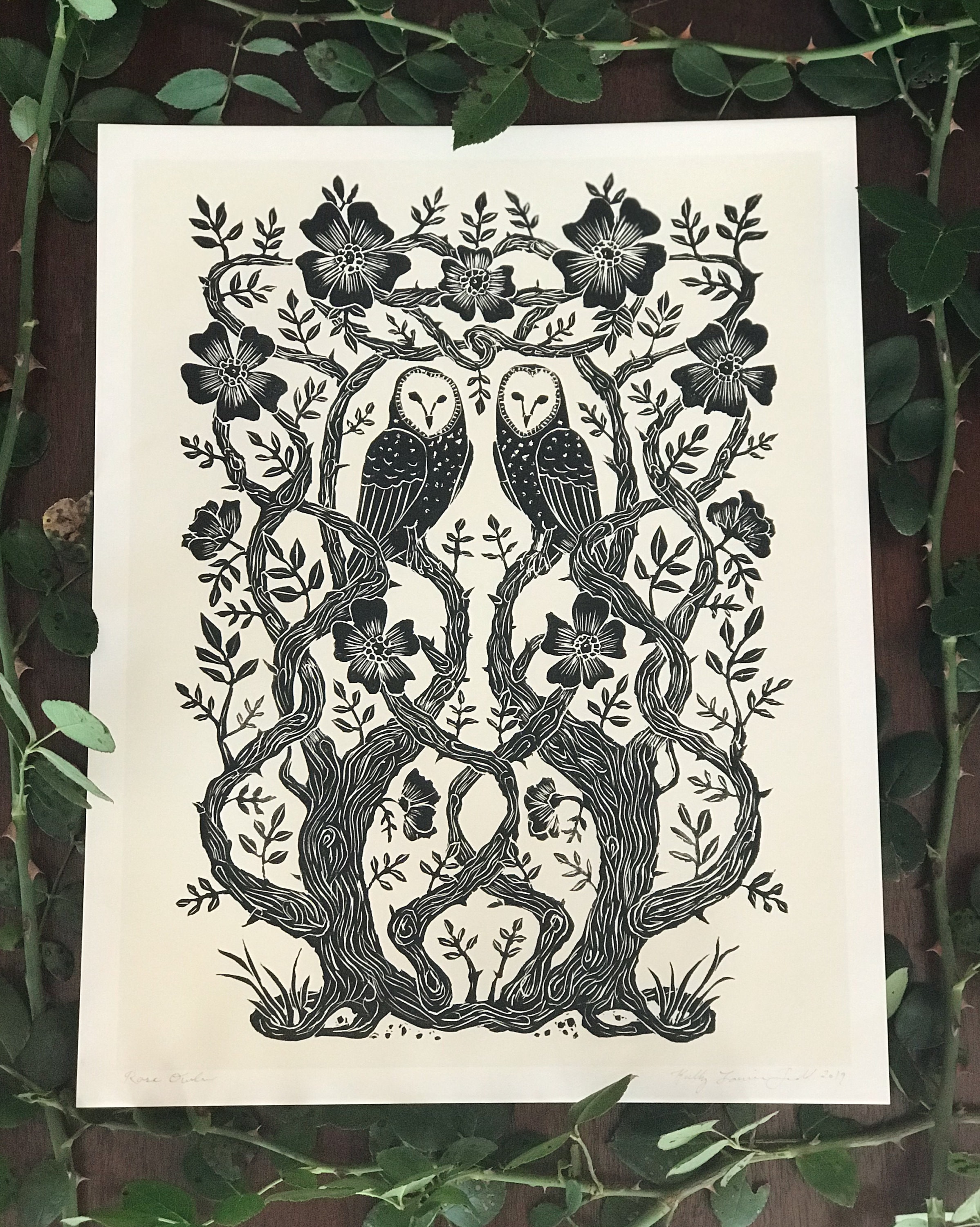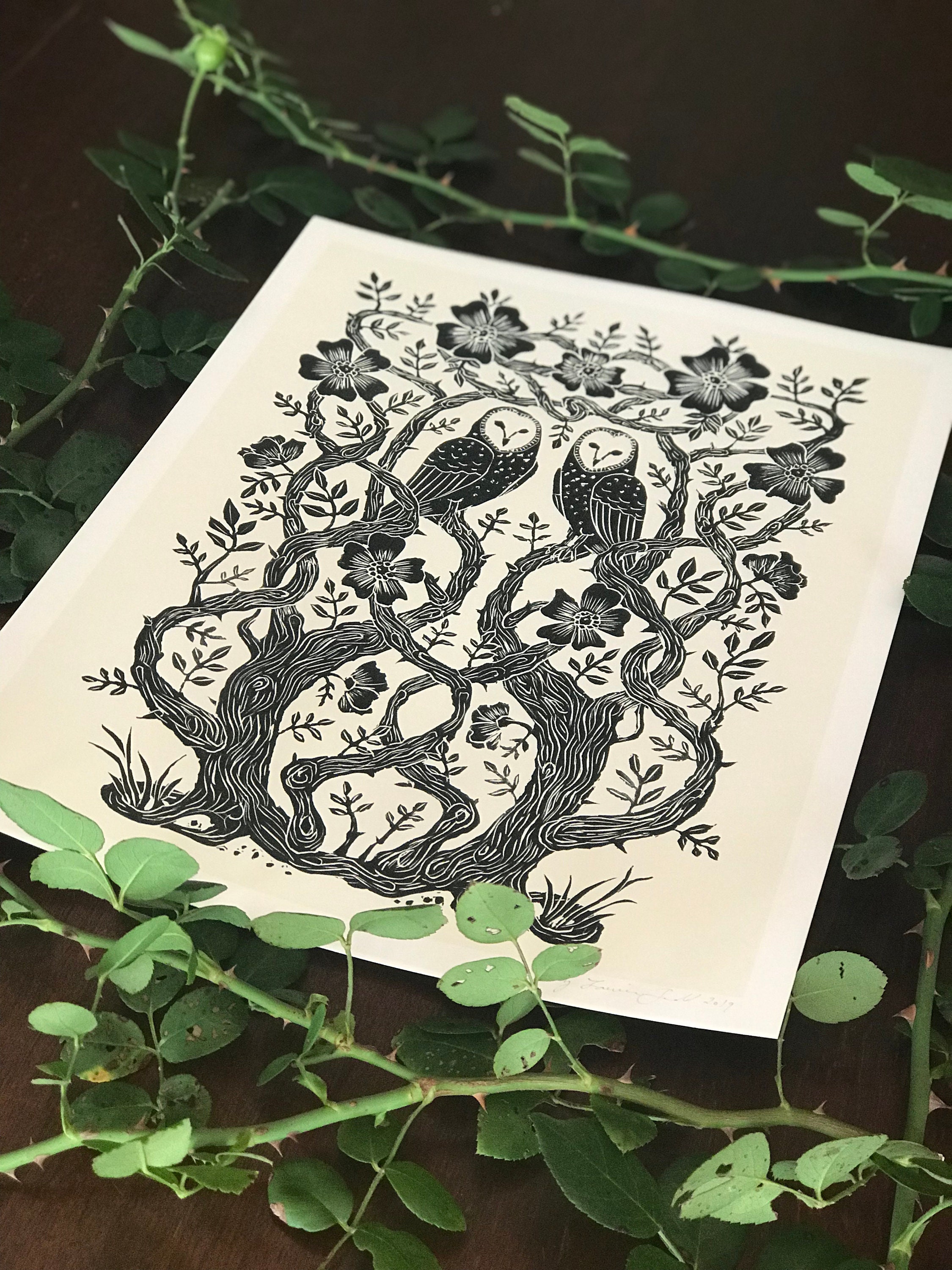 A print of the original block carving "Rose Owls"11" x 14", Printed with a 1/2" white border.Printed on heavy weight 100% cotton, acid free, natural white paper. Signed and dated on the front