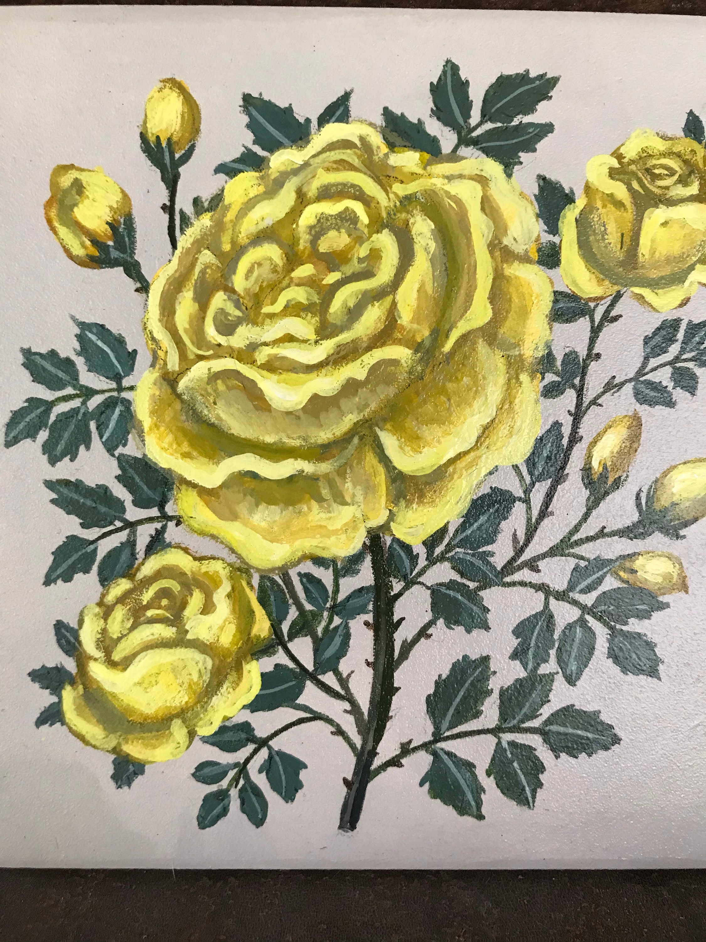 This one of a kind ceramic tile has been painted with gouache and sealed with a protective acrylic coating.